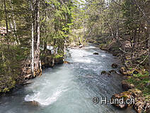 Ab Gstaad führt der wunderschöne Wanderweg bis nach Lauenen alles dem Lauibach entlang. Wer die Route abkürzen möchte kann bis nach Lauenen oder sogar bis zum Lauenensee mit dem Bus fahren. Mit der Gstaad-Karte fahren Zweibeiner kostenlos, Hunde zahlen den Halbtax-Preis. Der Rundweg um den See dauert etwa eine Stunde. Wer die Strecke von Lauenen zum Lauenensee zu Fuss geht, sollte unbedingt den Weg entlang des Baches wählen. Durch die wildromantische und märchenhafte (wir tauften diese Strecke "Koboldweg") Rossfallenschlucht schlängelt sich der Wanderweg dem immer breiter werdende Lauibach entlang. Oft sind wir stehen geblieben, haben die Bänkli-Gelegenheiten genutzt und die wunderschöne Natur auf uns wirken lassen.